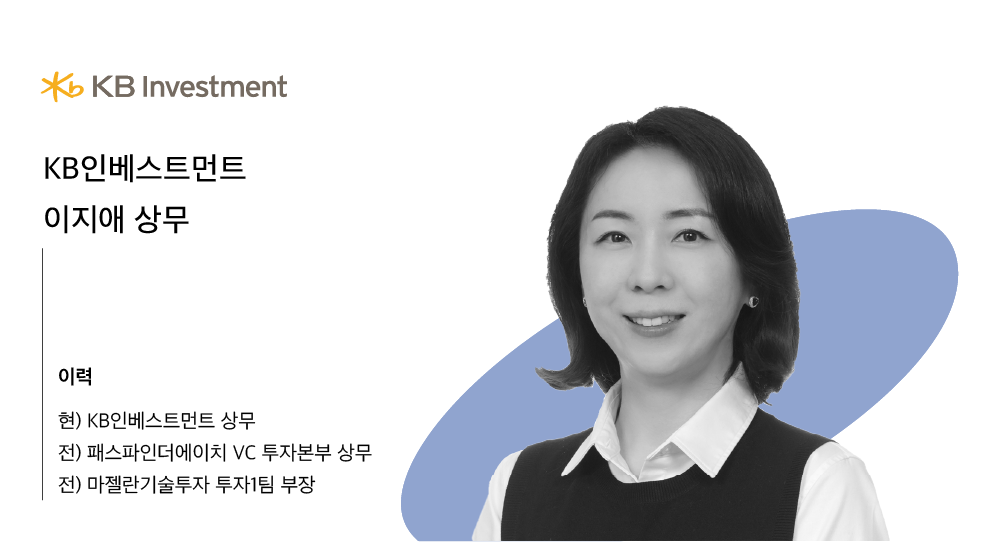 이지애 상무가 몸담고 있는 KB인베스트먼트는 국내 Top tier VC 중 하나로, 전체 운용 규모가  2조원에 달하며 Tips 운용사이기도 합니다. 매년 포트폴리오의 30% 가량은 Early stage에 투자하고 있는 All round VC 입니다. 대표 포트폴리오로는 스푼라디오, 채널코퍼레이션, 크래프트테크놀로지, 눔, 번개장터, 쏘카, 서울로보틱스 등이 있습니다.